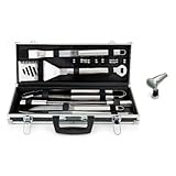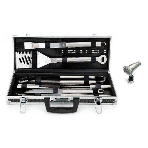 - Combo kit includes: 4-in-1 spatula, bbq fork, bbq tongs, basting brush, 8 corn holders, 4 skewers, and a high quality knife all of this in an awesome black aluminum carrying case